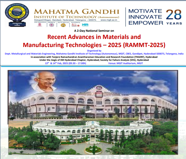 13 Feb 2025 - 14 Feb 2025 | Organized by: Metallurgical and Materials Engineering, MGIT in association with the Indian Institute of Metals (Hyderabad Chapter) under the aegis of TRAERF, Hyderabad