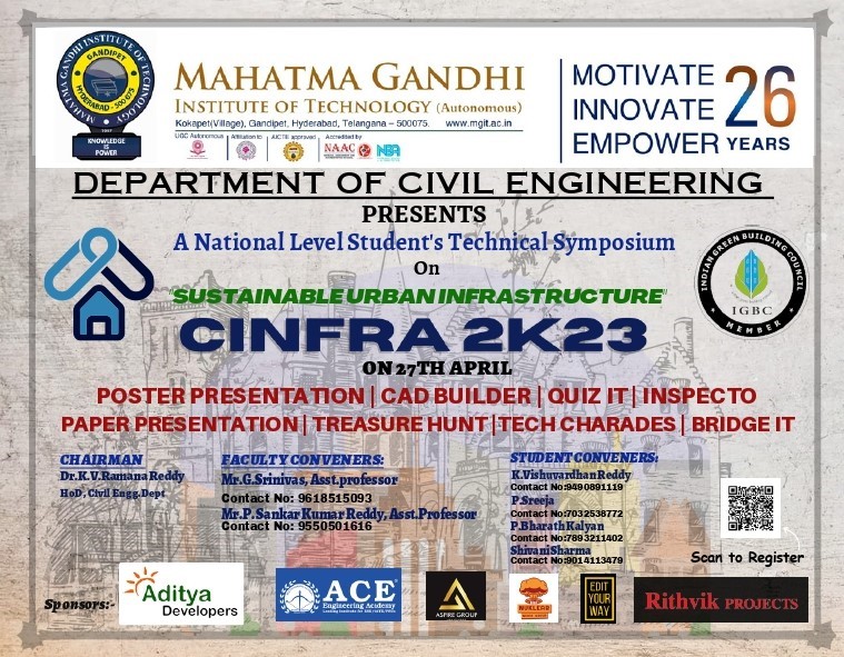 CINFRA is a National Level Technical Symposium being organized by our illustrious institution, MGIT, annually since 2013. The symposium became a trade mark of knowledge; parallel to this, it enhanced the reputation of department. It became a stage to a common student to let his voice heard to many, paying a way for creating awareness regarding the emerging Civil Engineering trends across the world. The enthusiasts of many colleges participate and witness the symposium that includes many thought provoking events apart from a general symposium.