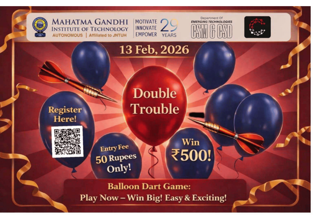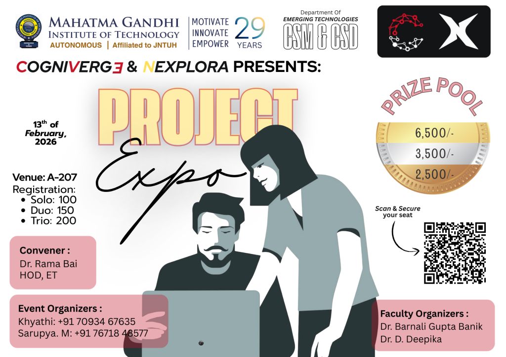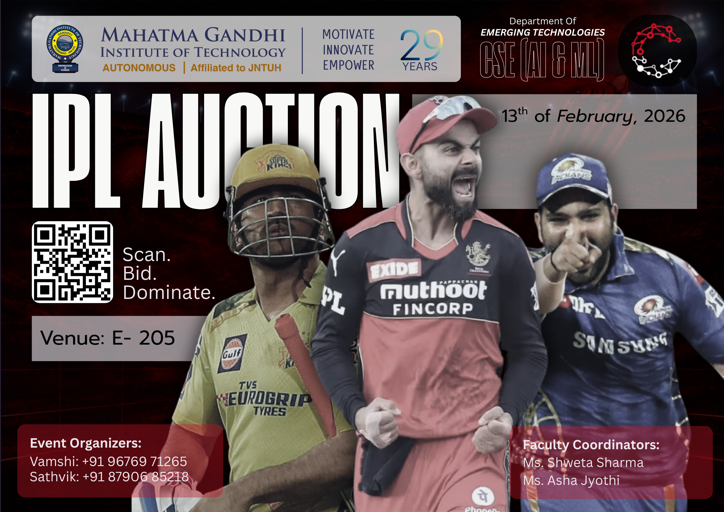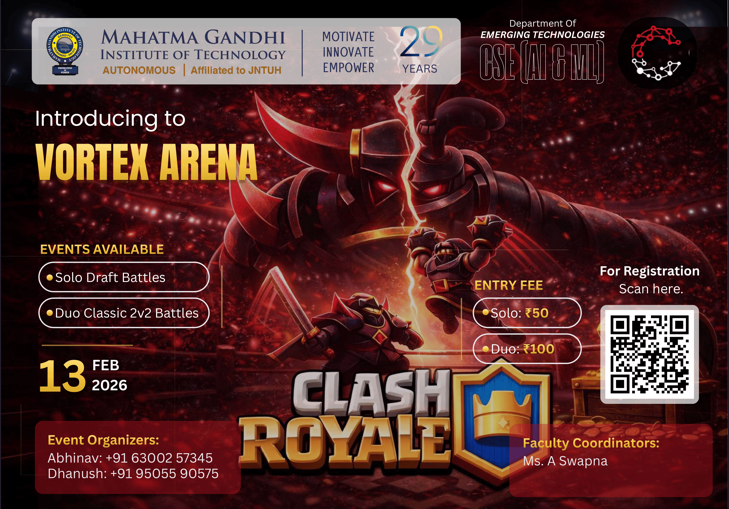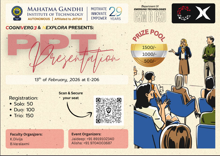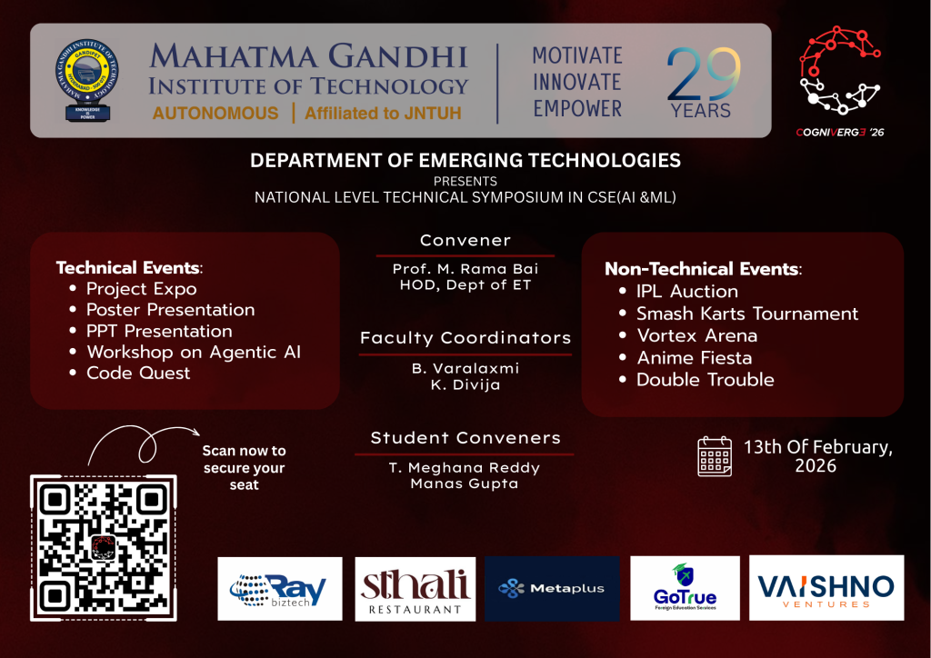 Cogniverge is a technical and non-technical fest organized by the Department of Emerging Technologies (CSE – AI & ML), Mahatma Gandhi Institute of Technology. The event aims to bring together students to explore innovation, creativity, and technical expertise through a diverse set of competitions and workshops. Cogniverge provides a collaborative platform for participants to enhance problem-solving skills, showcase talent, and engage in cutting-edge technological and recreational activities.