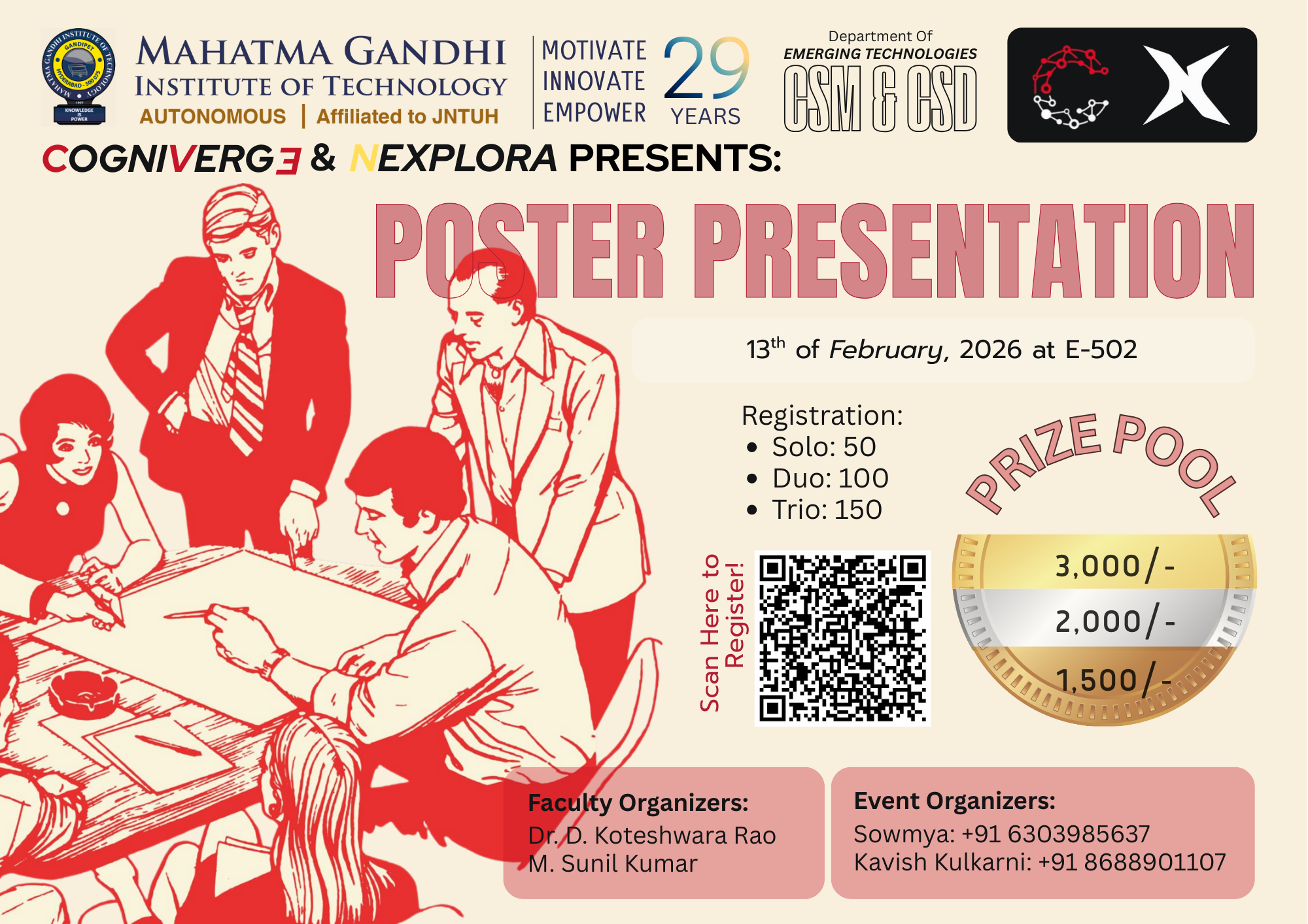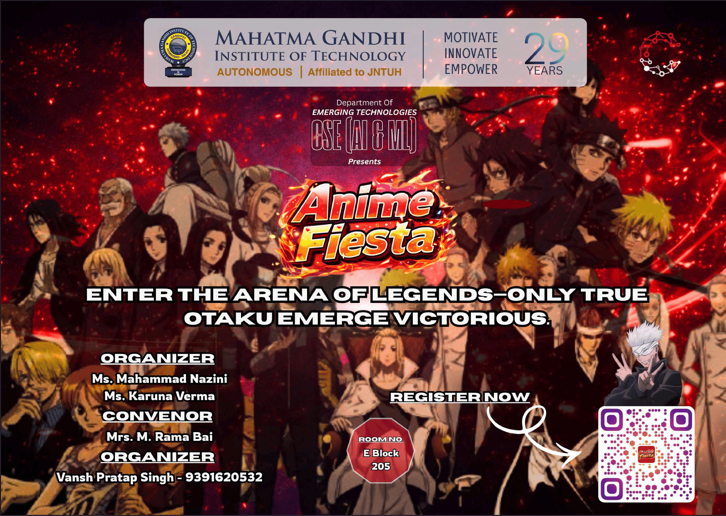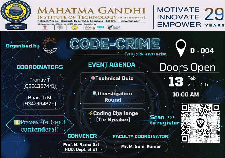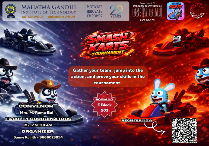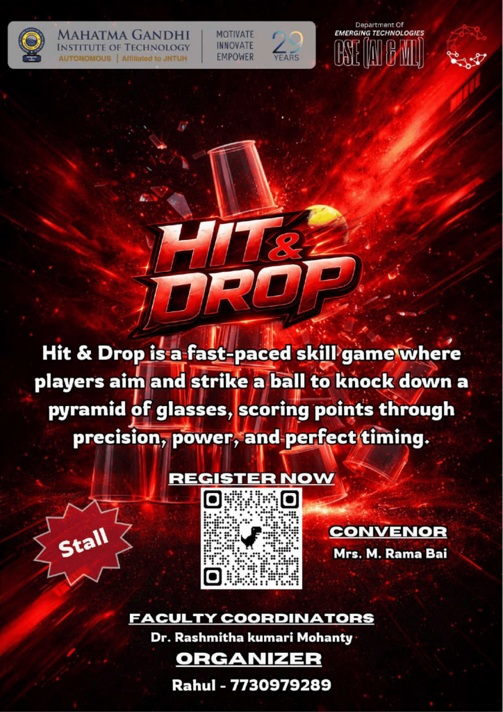 Cogniverge is a technical and non-technical fest organized by the Department of Emerging Technologies (CSE – AI & ML), Mahatma Gandhi Institute of Technology. The event aims to bring together students to explore innovation, creativity, and technical expertise through a diverse set of competitions and workshops. Cogniverge provides a collaborative platform for participants to enhance problem-solving skills, showcase talent, and engage in cutting-edge technological and recreational activities.