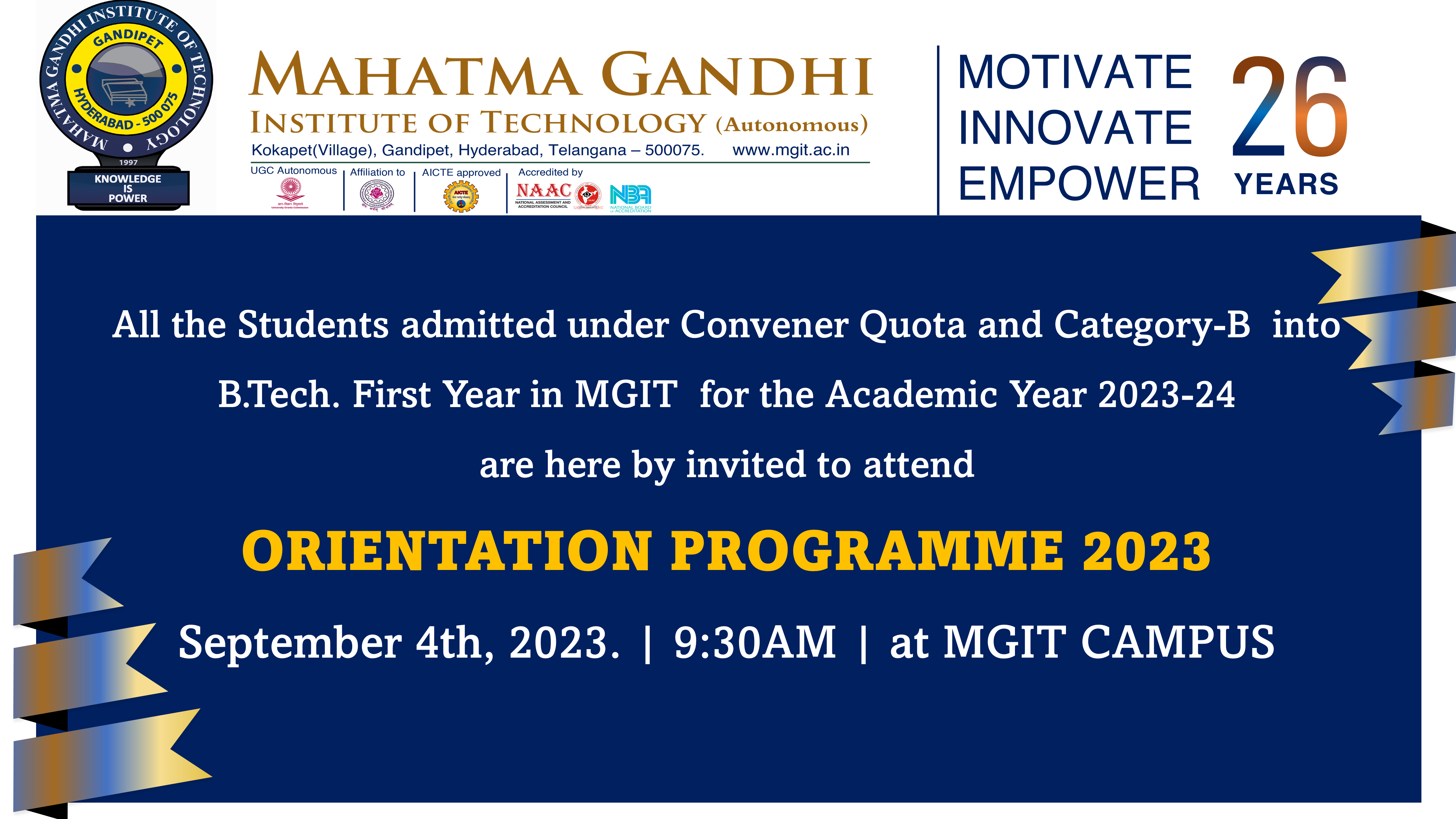 Welcome to MGIT, the institution that shapes tomorrow’s engineers! We are thrilled to have you join us for the Academic Year 2023-24. To kickstart your academic journey, we invite you to our Student Orientation and Induction Programmes on September 4th, 2023.