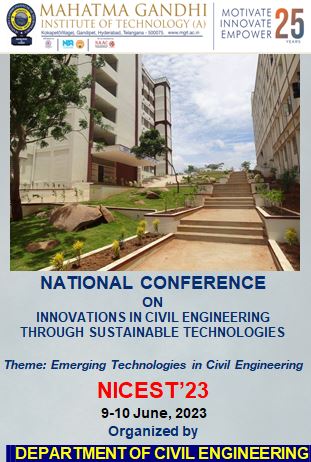 National Conference on “Innovations in Civil Engineering Through Sustainable Technologies (NICEST’21)” is organized by Department of Civil Engineering, MGIT. The inaugural conference, NICEST‘18, was held in February, 2018. Subsiquently the Conference is being held every year on thrust areas of research related to sustainability. It is being organized with main focus to enable researchers, academicians and industry experts to exchange ideas and share the knowledge to lead the society towards sustainable development. This conference facilitates a platform to present ideas and discuss future R&D requirements that would enhance sustainable development in the field of Civil Engineering, which is a commendable topic as the natural resources are declining at a rapid rate with intensification of technological and infrastructural expansion. Department of Civil Engineering, MGIT has taken up the responsibility to bring best of the academicians, researchers and industry experts to discuss these issues at a single venue, to come up with feasible solutions by organizing a national conference.