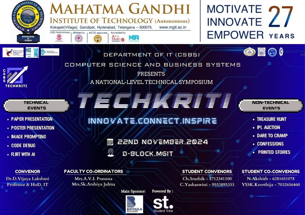 TECHKRITI is a one-day national-level technical symposium organized by the Department of Computer Science and Business Systems (CSBS) at Mahatma Gandhi Institute of Technology (MGIT), Hyderabad on 22nd November 2024.