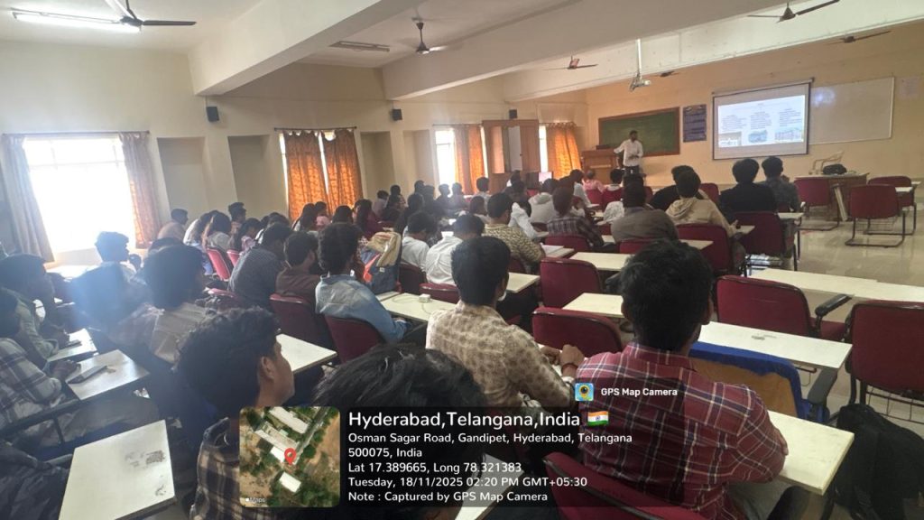 The Industry Institute Partnership Cell (IIPC), in collaboration with the Department of Civil Engineering, MGIT, organized an expert lecture on “Innovative Infrastructure Solutions through Pre-Engineered Buildings” on 18-11-2025, from 2:00 PM to 4:00 PM at E-101.
