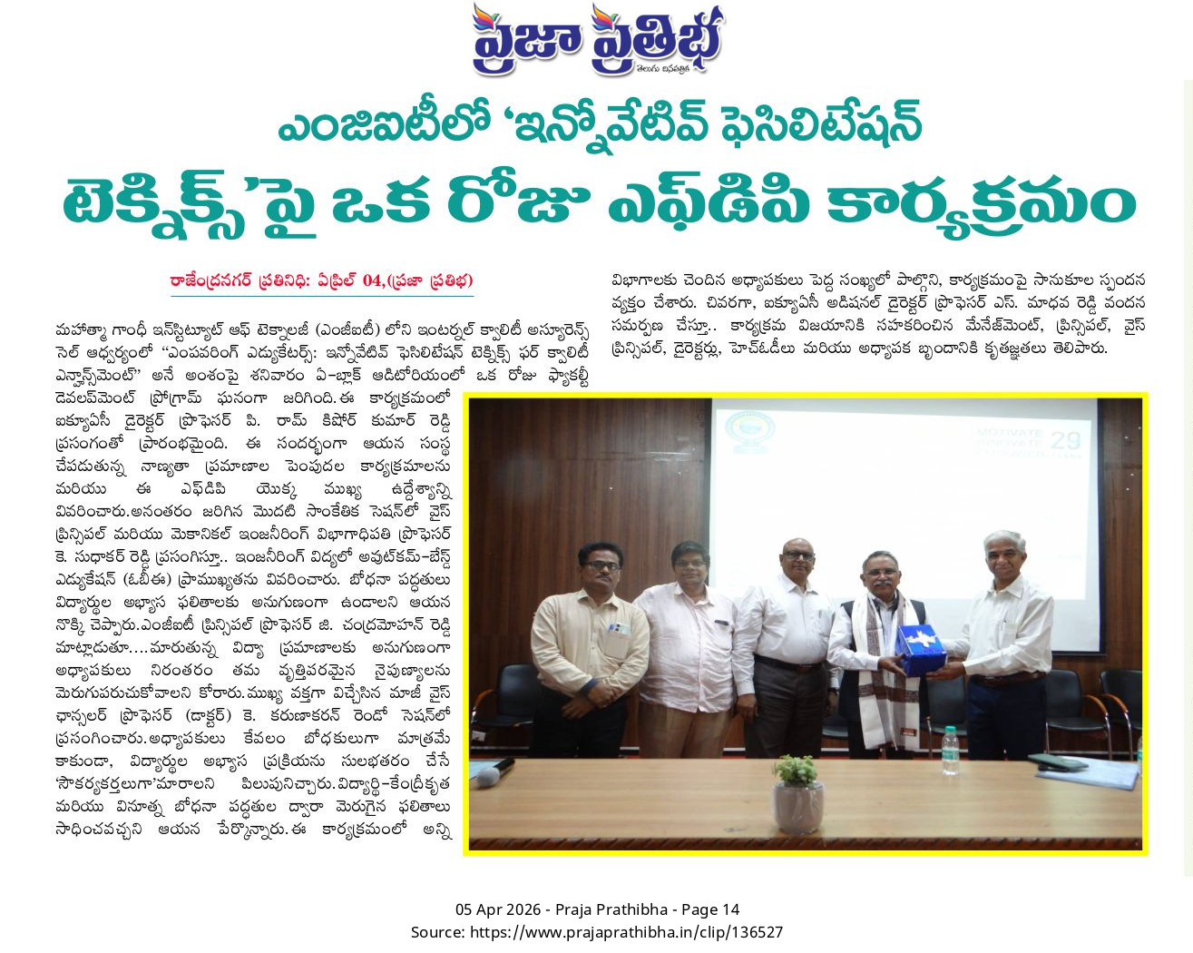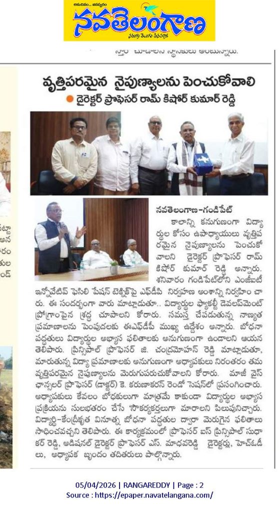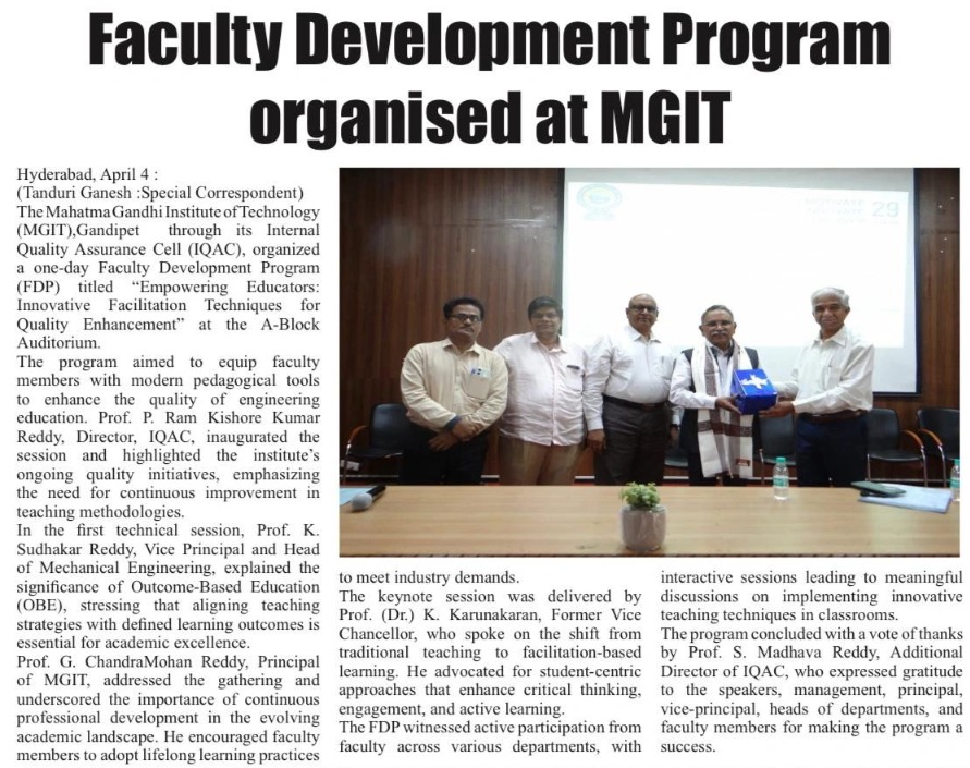 The Internal Quality Assurance Cell (IQAC) of Mahatma Gandhi Institute of Technology (MGIT) successfully organized a one-day Faculty Development Program (FDP) on the theme “Empowering Educators: Innovative Facilitation Techniques for Quality Enhancement” on April 4, 2026, at the A-Block Auditorium.
