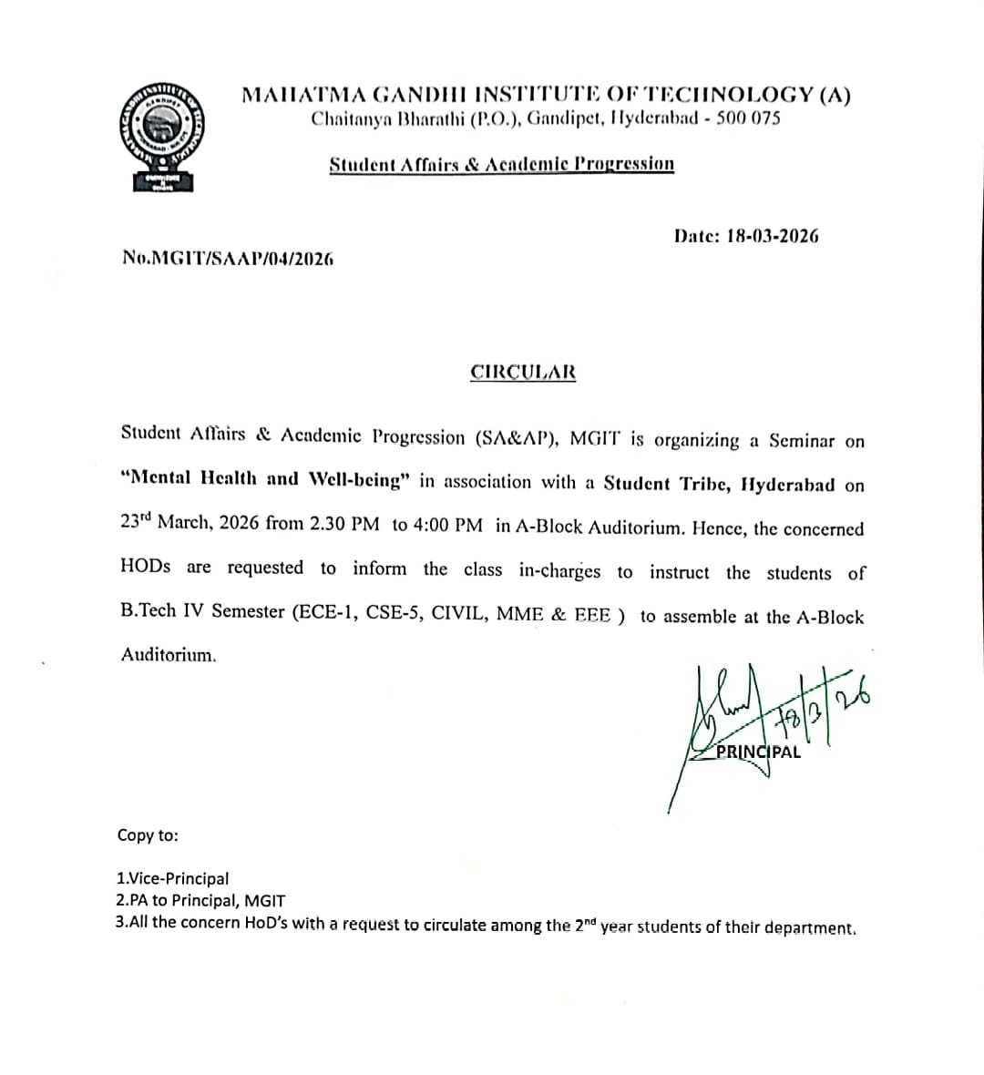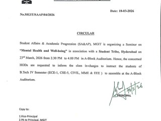 Hyderabad, March 23, 2026: The Student Affairs & Academic Progression (SA&AP) cell of Mahatma Gandhi Institute of Technology (MGIT), Hyderabad, organized an impactful seminar on “Mental Health and Well-being” to highlight the growing importance of psychological fitness among students.
