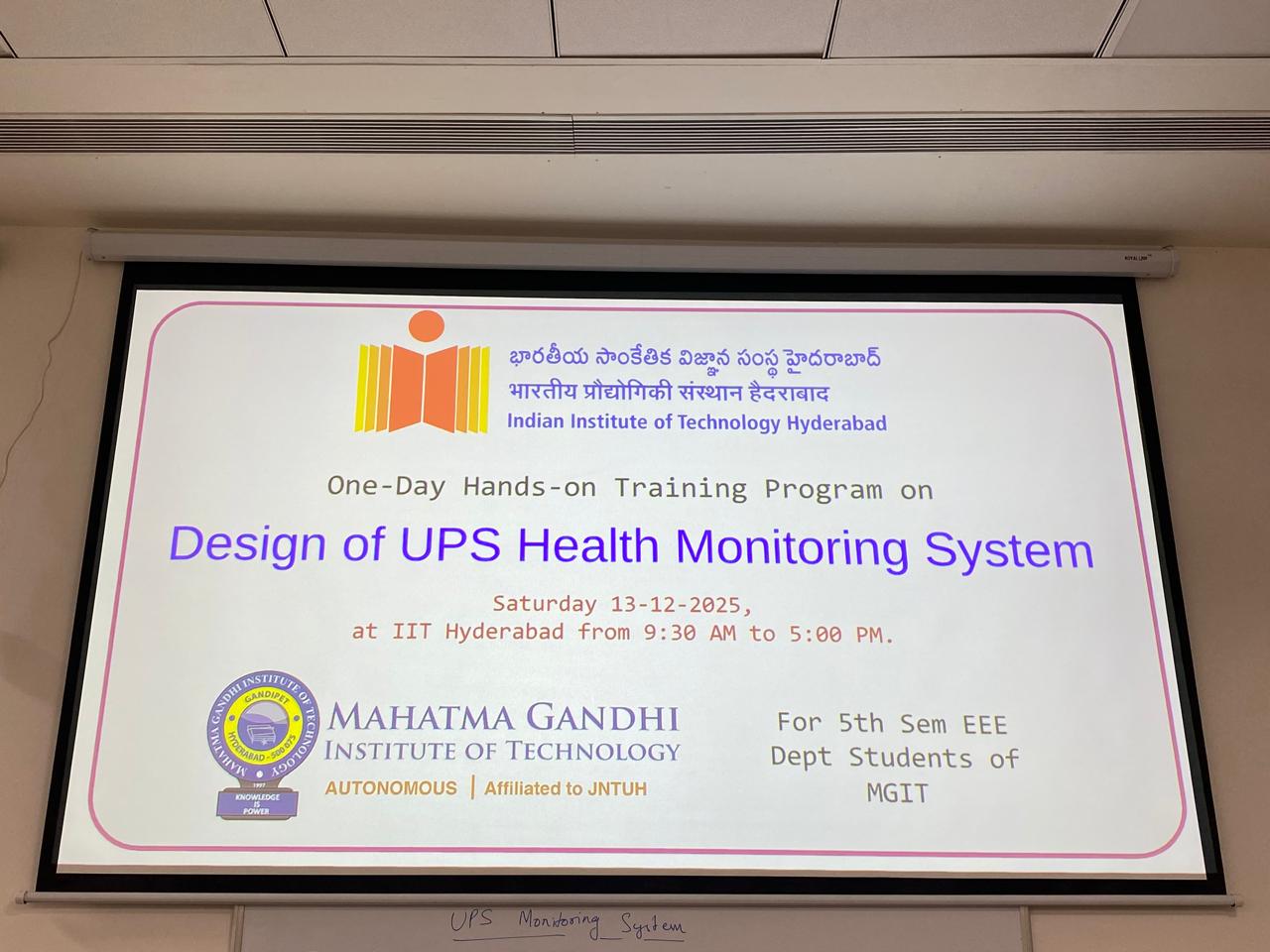The B.Tech V Semester students of the Department of Electrical and Electronics Engineering (EEE), Mahatma Gandhi Institute of Technology (MGIT), participated in a one-day hands-on training program on the Design of a UPS (Uninterruptible Power Supply) Health Monitoring System at the Indian Institute of Technology Hyderabad (IITH) on 13th December 2025.