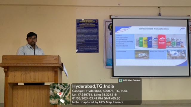 On January 5th, 2024, a significant Guest lecture was hosted in the Seminar Hall (E-101) of the Civil Engineering Department, drawing attention to the evolving landscape of sustainable concrete solutions. The lecture featured Soma Venkat and J Narendra from JSW Cement, who shared their expertise with an audience of eager III and V semester B.Tech Civil students.