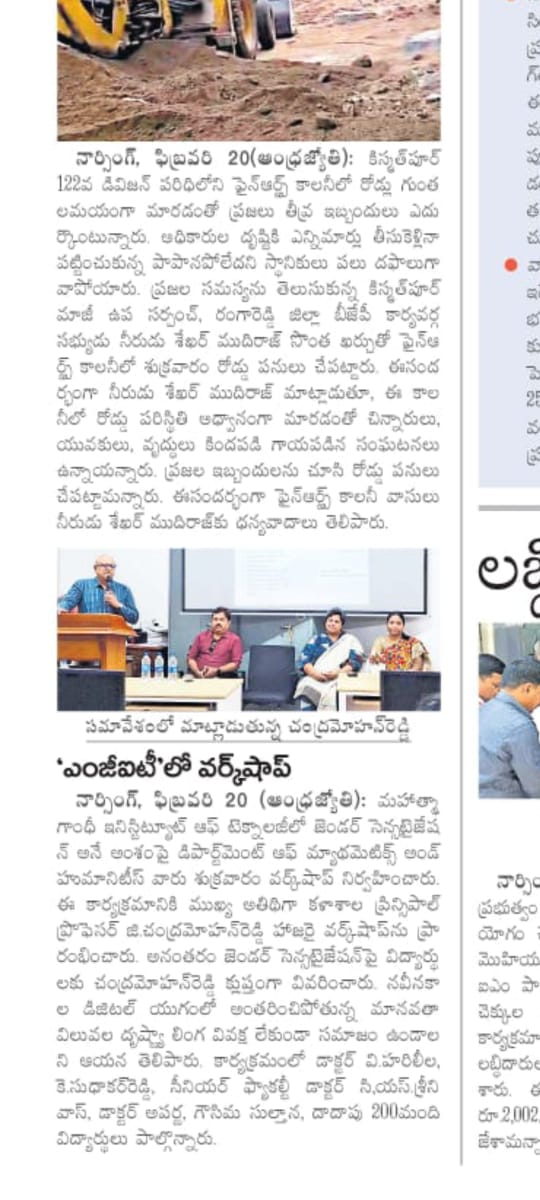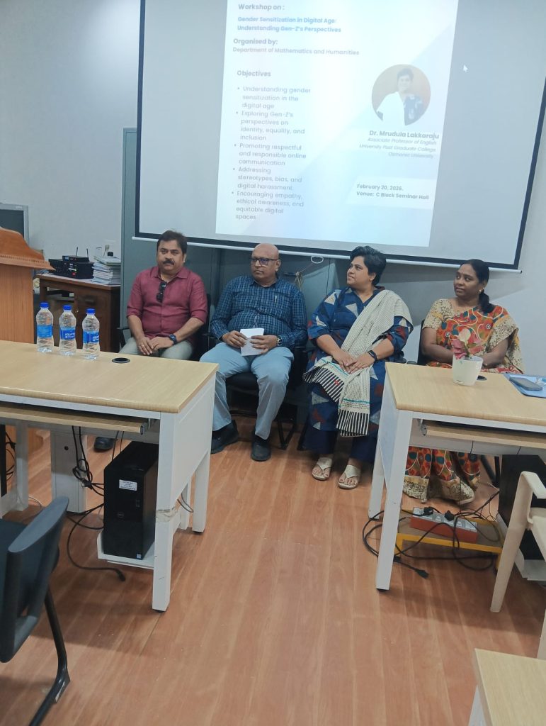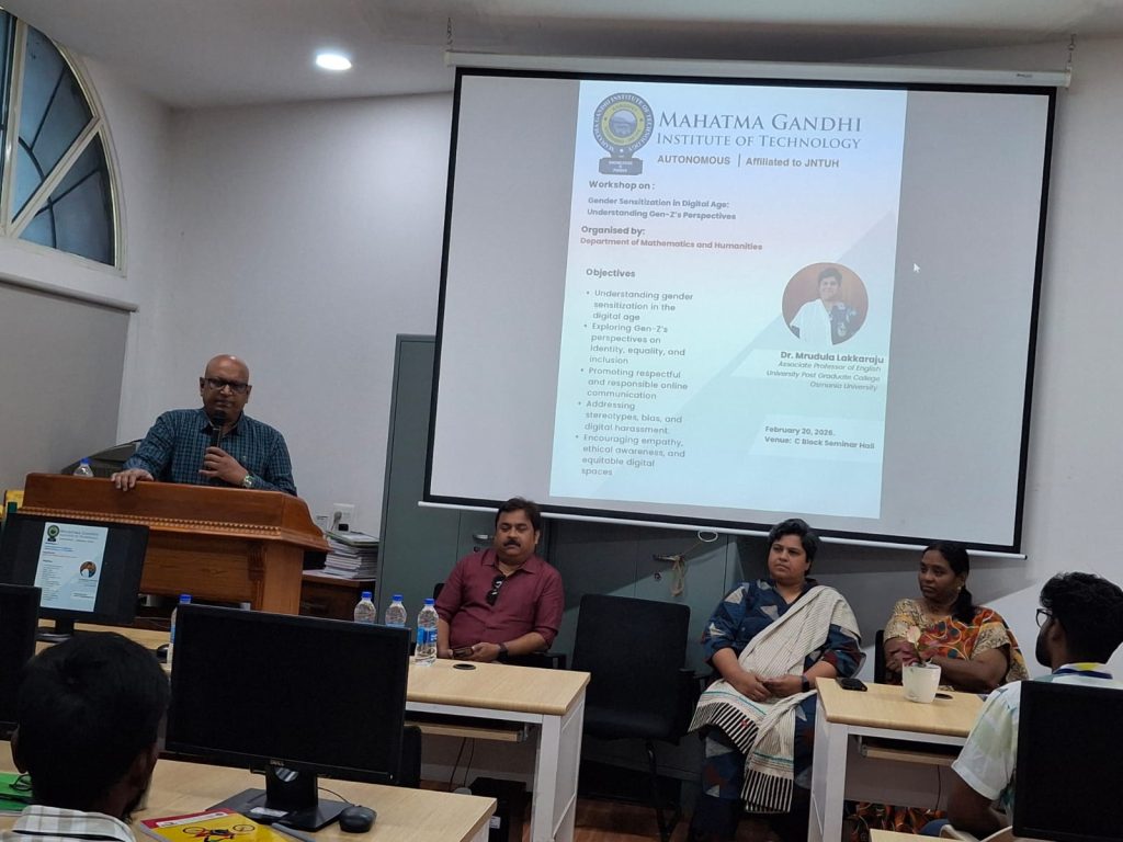 The Departments of Mathematics and Humanities at Mahatma Gandhi Institute of Technology organized an insightful workshop on 20 February 2026 on the topic “Gender Sensitization in the Digital Age: Understanding Gen Z Perspectives.” The session was delivered by Dr. Mrudula Lakkaraju, Associate Professor, Department of English, Osmania University.